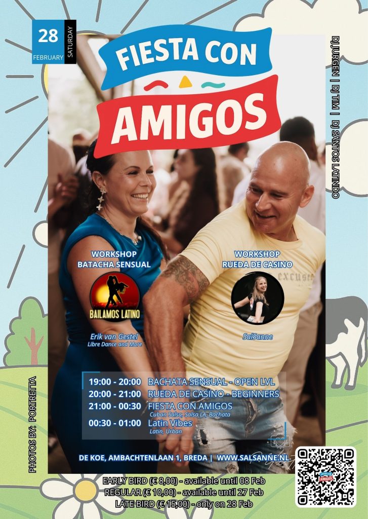 Op zaterdag 28 februari 2026 organiseren we weer een nieuwe editie van Fiesta con Amgos. Een avond waar de DJ’s de lekkerste Salsa LA, Salsa Cubana en Bachata draaien. Ook hebben we aan het begin van de avond weer 2 gratis workshops om alvast lekker warm te worden.